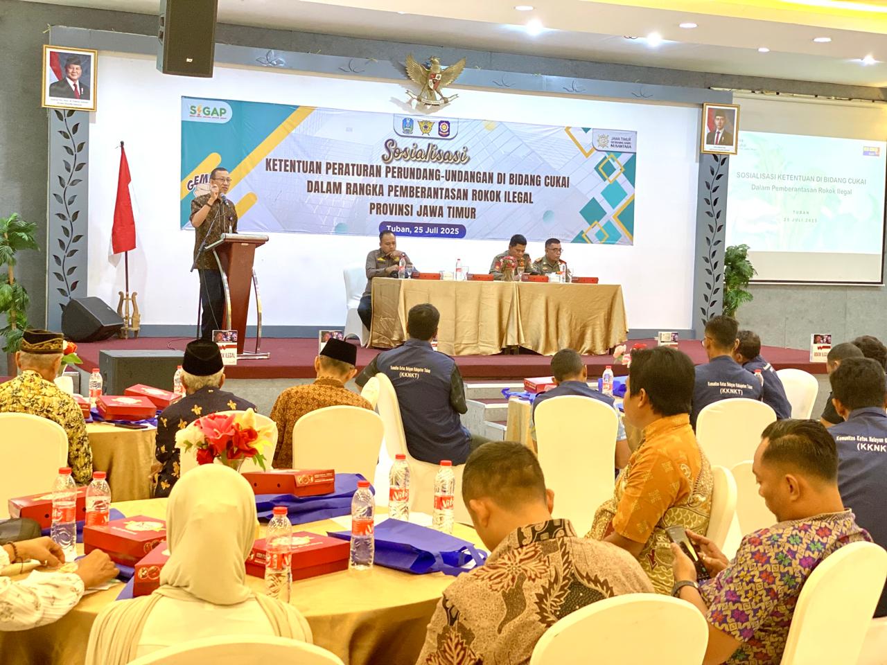 Tampak hadir dalam giat tersebut perwakilan Bea Cukai Kanwil Jatim I, Satpol PP Jatim, Kasatpol PP dan Damkar Tuban, serta puluhan peserta dari unsur komunitas, tokoh masyarakat, tokoh agama, akademisi dan paguyuban toko kelontong.